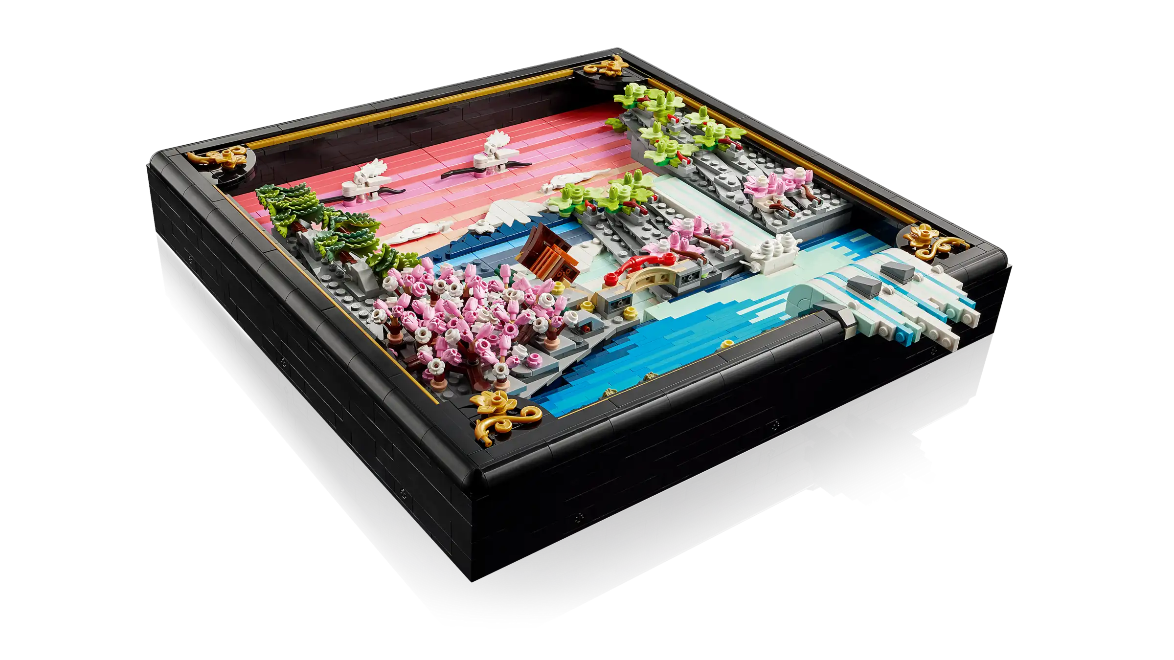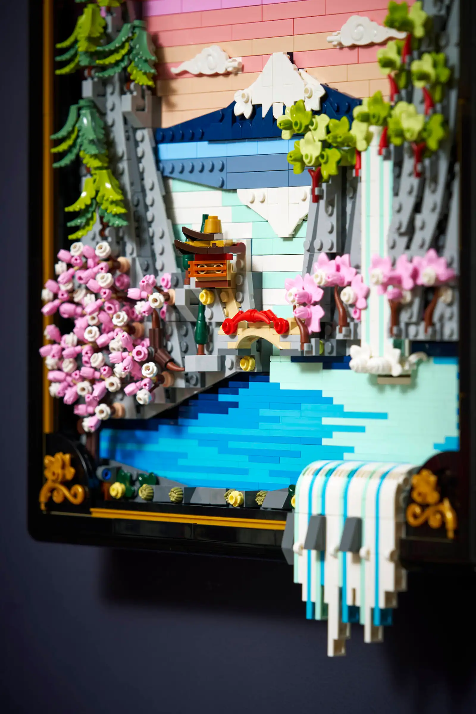 Bring color and nature into your home with this LEGO® Art Japanese Cherry Blossom Landscape (31218) building set for adults. Inspired by the beauty of springtime in Japan and the country’s Ukiyo-e artists, this stunning brick-built 3D wall art features Mount Fuji, a teahouse, a bridge, a waterfall, flying Japanese cranes, and cherry blossom, ’Sango-Kaku’ maple and Japanese umbrella pine trees. This aesthetic room decor comes in a black lacquer shadow box frame and has 2 display options. It canbe mounted on a wall with a hanger or freely stood on a flat surface. The artwork’s waterfall flows beyond the frame so on a wall it pours directly out, or it can be adjusted to spill out onto a flat surface. This LEGO art set offers a calm, immersive and mindful experience for adults as you build the botanical wall art from LEGO bricks. A treat for yourself or a Japanese gift idea for art lovers, this model includes instructions to guide you through a creative activity. Set contains 1, 892 pieces.