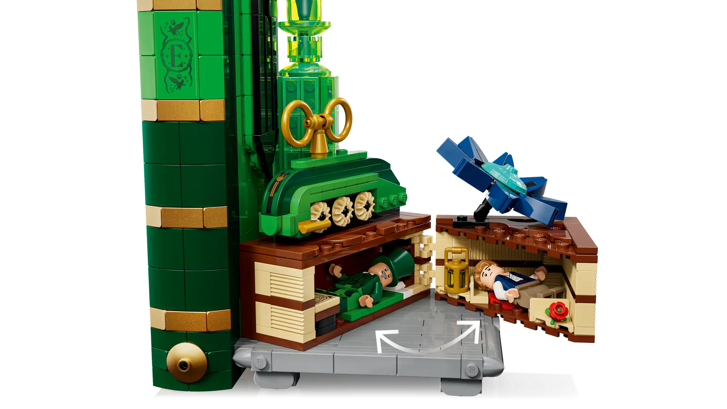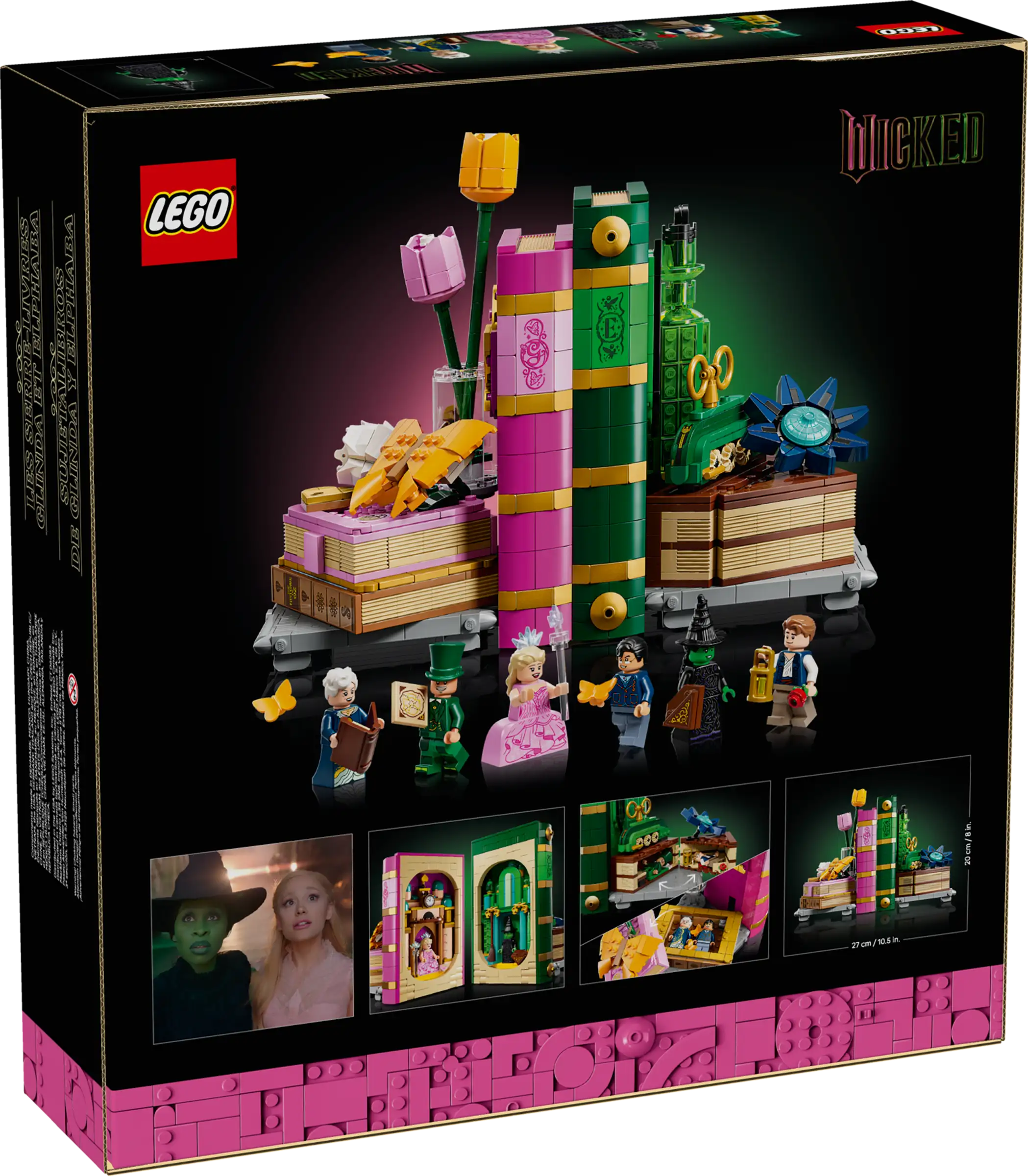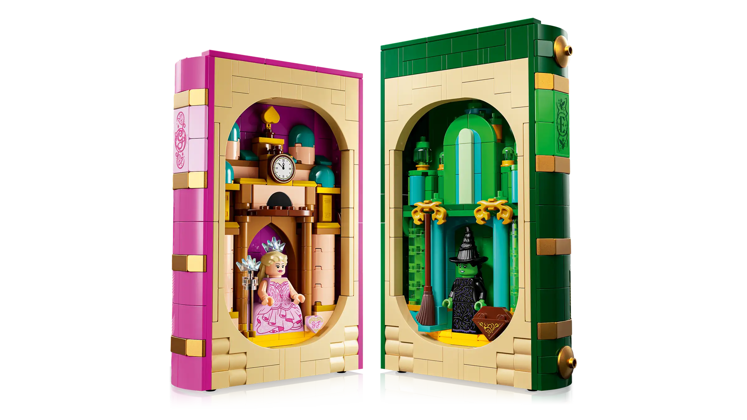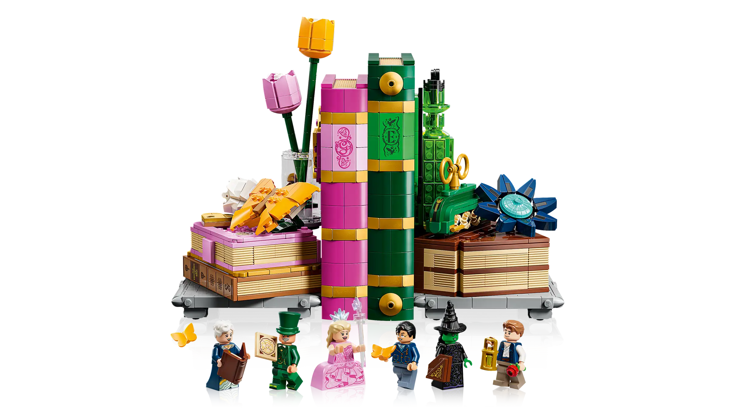 Elphaba’s green bookend includes her green elixir bottle, a model of Emerald City and a Grimmerie housing with secret compartments for The Wizard and Fiyero minifigures. Inside Glinda’s pink LEGO book nook is a Shiz University model. A butterfly model nestles on top of a book stack that has a compartment for the Madame Morrible and Pfannee minifigures.